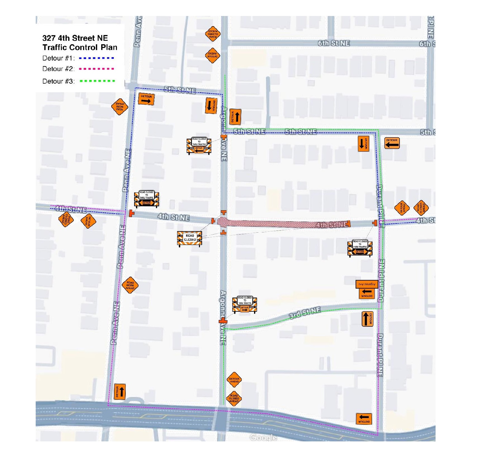 Detours: Motorists traveling East on 4th Street NE, turn left on Penn Ave. NE., turn right on 5th St. NE., turn right on Argonne Ave. NE., turn left on 5th St. NE., turn right on Durant Pl. NE., and left on 4th St. NE.